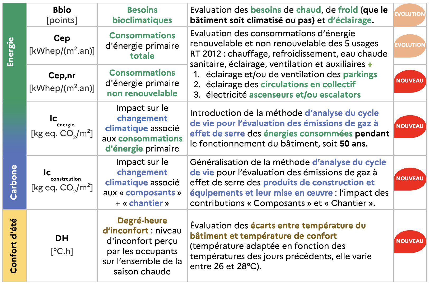 Pour cela six indicateurs viennent remplacer les 3 indicateurs initiaux liés à la RT2012. (Voir tableau ci-dessous extrait du guide RE2020 à télécharger plus bas)